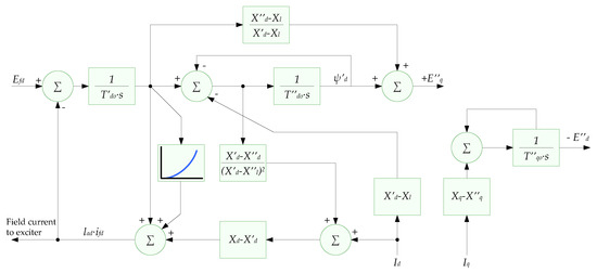 - Wang, Q.Y.; Wang, Y. Magnetic Saturation in Synchronous Generator Dynamic Models for Power System Stability Studies. In Proceedings of the 2019 IEEE Canadian Conference of Electrical and Computer Engineering (CCECE), Edmonton, AB, Canada, 5–8 May 2019. [Google Scholar]