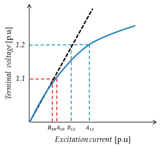 The values A10, B10, A12 and B12 are parameters that are required to be calculated for the modeling of a synchronous generator. These parameters are obtained from the no-load characteristic, which can be found in the generator datasheet. Figure 3 shows an example of a typical saturation test plot that is used to obtain the no-load characteristic.