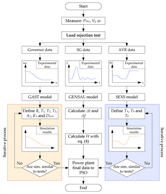 Finally, a schematic flowchart that sums up the power plant characterization methodology using load rejection tests is plotted in Figure 7. The iterative process used to fit the parameters of the GAST and SEXS models has been carried out manually in order to adjust the first transient oscillation, which is the most important for stability studies. However, other fitting tools such as evolutionary algorithms could be used to solve the problem [27,28,29].