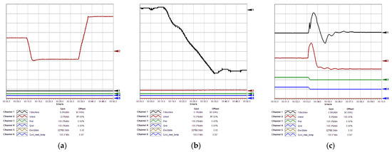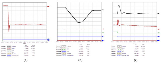 A series of records of the tests were carried out on more than 60 gas power plants of the Spanish power grid. The steady-state and transient measurements were registered using a 4-channel oscilloscope where the machine’s frequency (CH1 = f), the AVR output voltage (CH2 = EFD) and the output active and reactive power (CH3 = PS, CH4 = QS) were measured. The last two variables were used to fit 10–15% of the rated power condition and to monitor the load rejection. The registers were carried out during 60 s, but different time spread responses were found attending to the different power plants inertias and to the AVR and speed governor settings. The maximum, minimum and time settings for each channel can be also observed in the oscilloscope registers shown in Figure 8, Figure 9 and Figure 10.
