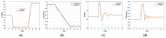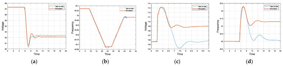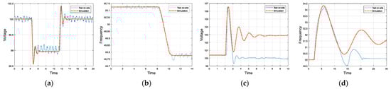 From the no-load voltage variation tests, some of the parameters of the AVR are fitted, and, analogously, from the no-load frequency variation tests, some speed governor parameters are fitted in a first iteration (the real responses can be observed from diagrams (a) and (b) of Figure 8, Figure 9 and Figure 10). Afterwards, the rest of the parameters are fitted from the load rejection test.