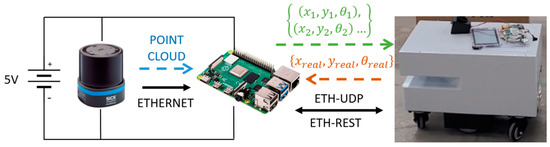 The system architecture (Figure 1) is composed of three elements: the LiDAR multiScan100 (from SICK, Waldrick, Germany), a Raspberry Pi 4 (from Raspberry Pi Foundation, Cambridge, UK), and Reeman’s Hussar robot (from Reeman Robotics, Shenzen, China). The process by which objects are detected is as follows: the LiDAR, powered by the same source as the Raspberry Pi, collects positional data of objects in the environment and transmits them to the Raspberry Pi as a point cloud. The Raspberry Pi compares the positions collected by the multiScan100 with the map. If an object not present in the map is detected, the system issues an alarm.