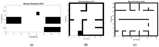 The rooms shown in Figure 2a–c correspond to environments of four, twelve, and thirty-three obstacles, respectively. These compartments represent real spaces. The first one simulates a room with two beds, a column, and a piece of furniture attached to the wall. The next two were designed as an office, that is, a room with different compartments separated by weak walls. The spaces in Figure 2b,c were implemented by adapting two example maps taken from Matlab R2020b Update 8, the computational software package used for the simulation experiments.