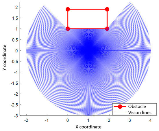 If there is an intersection with an obstacle, there is a reduction in effective sensor range (3). If there is no intersection, then the effective range is the maximum LiDAR range, i.e., . The end point of each vision line is calculated as shown in Equation (6).
