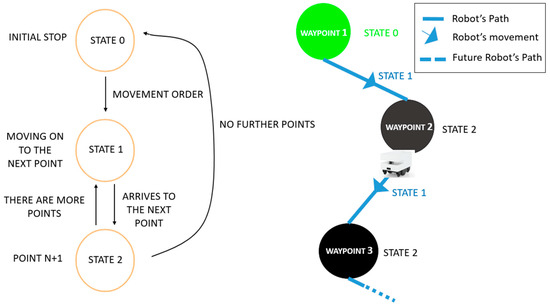 The objective of this study is to find the optimal trajectory in a defined space so that an automatic surveillance robot can work as efficiently as possible. For this purpose, a series of waypoints must be defined to establish a surveillance route. The robot works in the following way: it first recognizes a fixed set of points as coordinates and passes through them sequentially [32]. The robot follows the movement given by the state machine, shown in Figure 6, that has been coded. The right side of the figure shows the states reached by the machine along a trajectory.