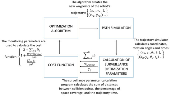 Each time the optimization algorithms provide a new combination of parameters, a program is called that converts it into XML. This file is read by the Python version 3.11.3. trajectory simulation program, exactly as the real robot would do. The simulator then stores the robot’s position at each instant of time, which is used by another Matlab version is R2020b Update 8 program that detects whether there has been a collision with an obstacle and calculates the distances between intersections, the percentage of vision (percentage that has been surveilled), and the trajectory time. Then, these parameters are used in the cost function. In fact, the cost function of the optimization algorithm differentiates three cases: (i) there is a collision with one or more obstacles; (ii) there is no collision, but coverage of the space is not completed; and (iii) there is no collision, and coverage is completed.