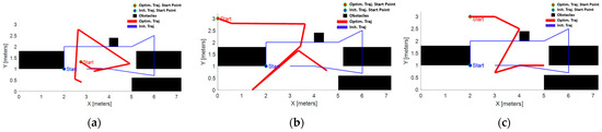 Figure 13a–c show that the best trajectory is the one obtained with PS, that is simpler and more straightforward, in contrast to the GA and PSO, where the robot makes many inefficient displacements. In particular, the final trajectory of the GA is the worst.