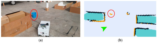 After calibrating the environment, an obstacle (the blue bucket circled in red) was introduced and the sensor’s reaction was observed. Figure 11a shows the object introduced into the real environment and Figure 11b shows how the laser sees it. As expected, the bucket points are shown in orange. This object is not identified as part of the map and, therefore, appears as a series of orange dots (current view) with no correspondence to the black dots (mapped view). The points have been marked with a red circle to facilitate identification.