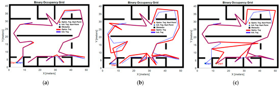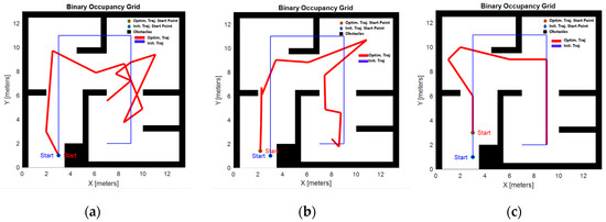 Trajectories in the medium-complexity room: Genetic Algorithm trajectory (a), Particle Swarm trajectory (b), and Pattern Search trajectory (c).