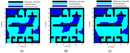 High-complexity room coverage: Genetic Algorithm coverage (a), Particle Swarm coverage (b), and Pattern Search coverage (c).