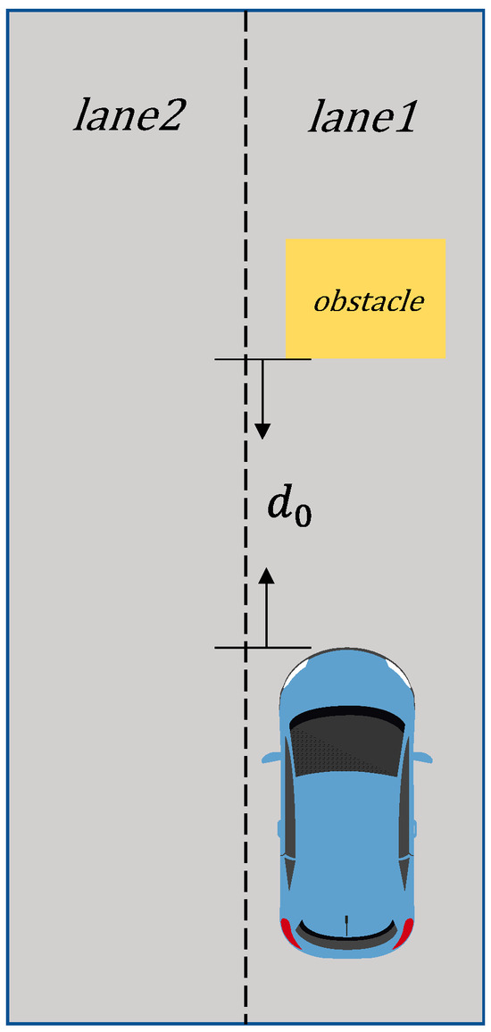 For the safe and comfortable execution of obstacle avoidance, it is imperative to institute a constraint on the spatial distance between the vehicle and the obstacles, known as the spatiotemporal safety constraint. Concurrently, ensuring the path’s smoothness and stability mandates restrictions on its curvature alterations. This restriction is termed the curvature constraint for obstacle avoidance. Considering both the vehicle’s spatial position and the spatial data of obstacles, dynamic control points are established by jointly considering spatiotemporal safety and curvature constraints. Figure 1 illustrates a straightforward lane-changing scenario for obstacle avoidance. Throughout this process, to prevent collisions, the intelligent driving vehicle must maintain the requisite safety distance. This ensures that the longitudinal distance between its current spatial position and that of nearby obstacles remains sufficiently expansive. Several assumptions are made for this analysis: (1) No obstacles exist on the neighboring lanes. (2) Obstacles ahead of the intelligent driving vehicle maintain a constant, lower speed. The longitudinal safety distance, often determined using TTC (time-to-collision) [31], serves as a measure for calculating the collision safety distance and assessing the safety level. This distance is influenced by the relative longitudinal velocity between the intelligent driving vehicle and the obstacle ahead [32,33,34]. Thus, the longitudinal safety distance between the vehicle’s real-time spatial position and the forward obstacle’s position can be denoted as , and its value can be derived from Equation (1).