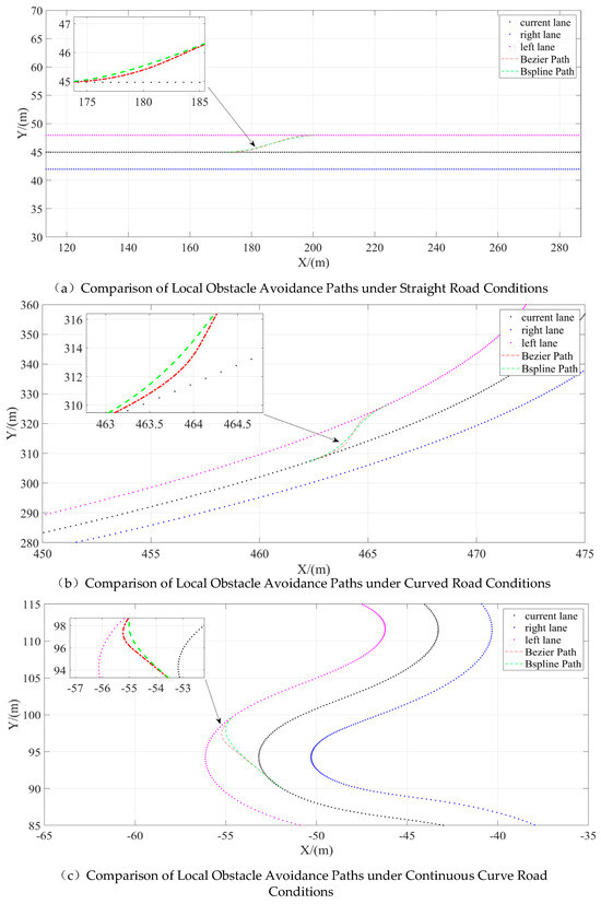 Considering three distinct spatial road characteristics, we factored in vehicle data, road specifics, and obstacle details to determine the control points for the local avoidance algorithm. Following this, we conducted curve discretization interpolation to devise the corresponding local avoidance path. For comparative analysis, we also generated a local avoidance path employing Bézier curves.