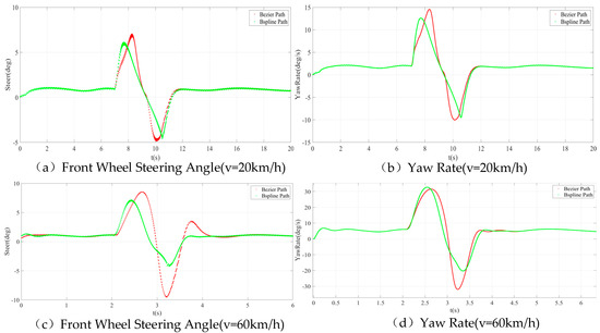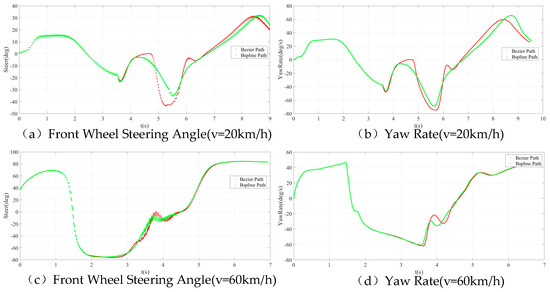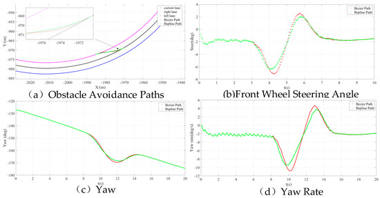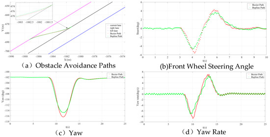 As can be seen from Figure 6, real-time variations in the vehicle’s front wheel steering angles and yaw angles emerge when traversing a straight road. When following the Bezier curve for obstacle avoidance, the maximum steering angles of the front wheel peak at 2.9° and 3.5°, with the maximum yaw angle rates of change reaching 6 deg/s and 17 deg/s, respectively. Conversely, when navigating via the refined B-spline curve obstacle avoidance method, the maximum steering angles of the front wheel are limited to 2.9° and 2.7°, and the peak yaw angle rate of change stands at 5.5 deg/s and 13 deg/s, respectively. Such observations underscore that on straight roads, trajectories designed using the B-spline curve algorithm manifest inherently smoother dynamics.