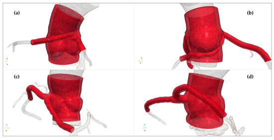 The results of our geometric modeling method for the four types of anomalous coronary courses are shown in Figure 2, superimposed on the respective STL reconstructions obtained by segmenting the CTA images.