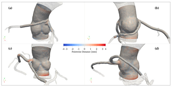 Pointwise distance between the STL reconstruction (ground truth) and the luminal surface of the geometric model in each type of anomalous course: (a) interarterial/intramural; (b) retroaortic; (c) subpulmonary; (d) prepulmonary. Colors are displayed as a function of distance. Positive values, in red, indicate that the STL reconstruction, shown in transparency, is outside the lumen model.