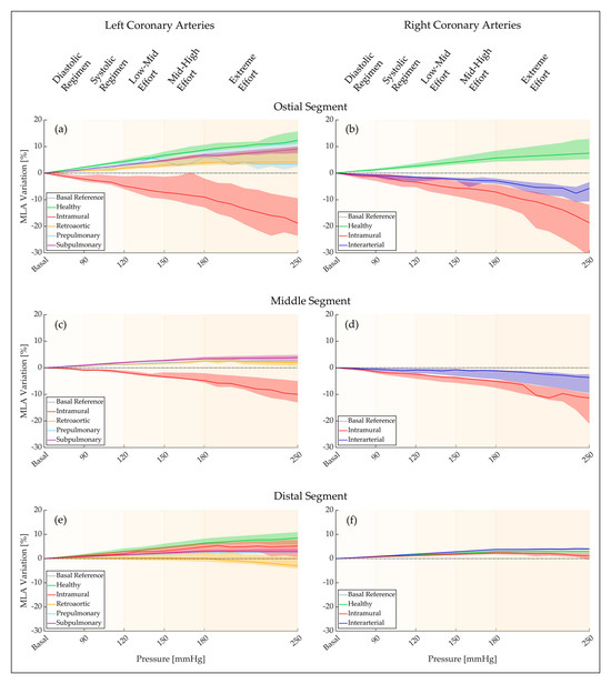 Median luminal area variations of coronary vessels at increasing simulated blood pressure: (a) ostial segment of the LCAs; (b) ostial segment of the RCAs; (c) middle tract of the LCAs; (d) middle tract of the RCAs; (e) distal segment of the LCAs; (f) distal segment of the RCAs. MLA variations are shown in green for healthy coronaries, red for AAOCAs with intramural course, light blue for AAOCAs with prepulmonary course, yellow for AAOCAs with retroaortic course, purple for AAOCAs with subpulmonary course, blue for AAOCAs with interarterial course, and no intramural tract. The black dashed horizontal line represents null changes in the MLA with respect to the reference sections in basal conditions.