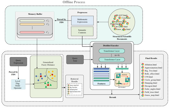Figure 1 presents a visualization of the workflow for the scientific document retrieval model. The Mathematical Expression Matching (MEM) module, utilizing the Formula Description Structure (FDS) [27] algorithm, centers its attention on each term within the mathematical expression. This generates unique expression features, facilitating the computation of similarity between the query expression and the candidate expression. The Content Semantic Matching module initially employs knowledge distillation techniques to transfer the language modeling capabilities of a well-trained teacher model into the student model. Subsequently, it uses the student network to construct a weight-shared twin network, calculating contextual semantic similarity. Ultimately, the similarities from both aspects are combined to determine the reordering results in scientific document retrieval.