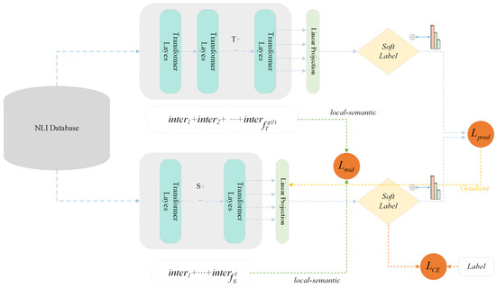 In the KD framework we have adopted, the knowledge refinement stage adheres to the widely recognized teacher–student structure, illustrated in Figure 2. A notable and effective approach involves KD from a BERT-like model into a Transformer structure. The primary objective is to facilitate the transfer of knowledge from a teacher model—often larger and more complex—to a student model, which is typically smaller. The ultimate aim is to ensure that the student model can sustain a level of performance akin to that of the teacher model. At the outset, pretrained language models are leveraged to initialize model weights. The teacher model is constructed as a fixed parameter encoder, comprising T layers of transformer blocks. On the other hand, the student model consists of S layers (where S < T), and its parameters can be initialized using a pretrained model similar to BERT. It is worth noting that in the context of BERT-PKD [22], it has been demonstrated that using the BERT-Base model can be equally effective as employing the considerably larger BERT-Large model. Following model initialization, the proposed method for transferring local semantics within the model is introduced. This step is essential for imparting nuanced knowledge from the teacher to the student. Lastly, the process of knowledge transmission within the output layer and the computation of the comprehensive loss function is described. These final stages of the KD process are critical to ensure that the student model effectively inherits the wisdom of the teacher model and can achieve comparable performance.