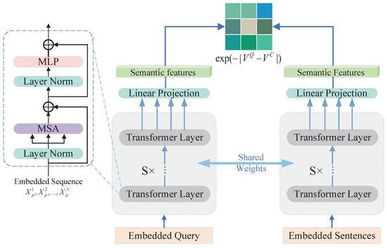 In this module, as inspired by the literature [30], we employ a twin network structure to compute the similarity between the query and candidate items. It comprises identical networks with shared weights following the distillation process, as illustrated in Figure 3. Before feeding sentences into the network, a preprocessing step is performed. For Chinese datasets, segmentation is the initial requirement, whereas English datasets do not necessitate segmentation. After that, stop words are removed, and sentence length is synthesized. The objective is to retain valuable semantics while mitigating the noise introduced by irrelevant data. Subsequently, semantic similarity is computed using the Manhattan distance. Based on experimental analysis, cosine similarity is deemed more suitable for measuring lexical-level semantic similarity as it focuses solely on the angle between two vectors. Conversely, the Manhattan distance [31] is found to be better suited for assessing text similarity at the sentence level and paragraph level. This is attributed to its capability to incorporate richer semantic information such as sentence length. The formula for calculating semantic similarity is shown below:
