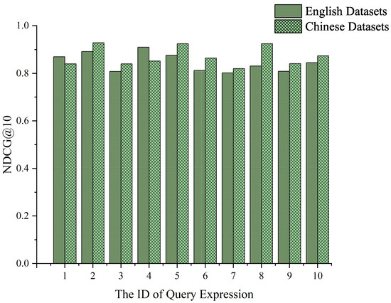 In this experiment, the mathematical expressions and query texts from Table 2 are employed for the statistical analysis of scientific document retrieval. Figure 4 displays the nDCG@10 scores obtained for various mathematical expressions.