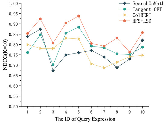 Figure 5 illustrates the average nDCG (K = 10) values across 10 query expressions when employing various methods. Notably, SearchOnMath [32] and Tangent-CFT [33] solely rely on the information within the mathematical expressions, without taking into account other attributes of scientific documents. This approach can occasionally result in matches with intermediate results from the mathematical reasoning process, potentially leading to the retrieval of scientific literature unrelated to the intended topic. Conversely, ColBERT [34]—characterized by numerous parameters and a large model—concentrates on modeling text content. However, this approach can introduce noise into the retrieval process, ultimately having a detrimental impact on the results.