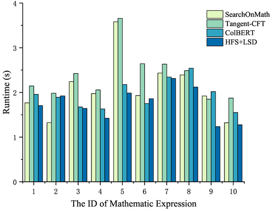 The primary objective of the method proposed in this study is to enhance the precision and efficiency of scientific literature retrieval models. As evident in the provided Figure 6, query execution time using different methods is a critical consideration, and it is apparent that the structure of mathematical expressions significantly influences this duration. Specifically, more intricate expressions require more time for execution. Through the process of decomposing mathematical expressions, establishing indexes, and utilizing the distilled model to compute semantic similarity, the method substantially reduces the time required for the model to retrieve the most suitable scientific documents. Consequently, the approach presented in this paper holds a distinct advantage in terms of execution time.