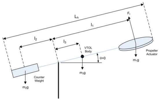 The VTOL system is a complete experimental setup used to investigate the dynamics of the aircraft along one axis (1 DOF), i.e., pitch. The propeller assembly acts as an actuator operated by a DC motor that provides uplift to the platform. The total length is divided into three segments, as shown in Figure 1, as , , and . The shows the angle of the platform and the horizontal axis will vary from . The various physical parameters of the VTOL system are described in Table 1.