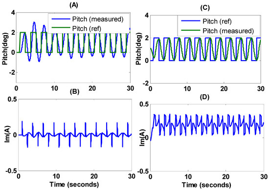 Figure 11 and Figure 12 show the pitch of the VTOL system with the actuator motor current tracking based on the cascaded control strategy using PID and PI in the LabVIEW platform interfaced with the QNET VTOL experimental setup, considering the values of , computed using Equation (21). The gains of the inner loop current controller are obtained as = 648 V/A and = 17.4 V/A. The results obtained using the experimental hardware setup are shown in Figure 11 and Figure 12, and they are closely mapped to the simulation analysis conducted in MATLAB, as shown in Figure 6. In Figure 11, the measured response of pitch shows slight delay due to the inertia of the overall VTOL assembly as compared to the reference value . The tracking the pulse generator signal has a frequency of 0.34Hz, magnitude of 2, and pulse width of nearly 50%. The experimental result based on the cascaded control strategy is better than that of the PI-based VTOL system shown in Figure 9 and Figure 10. The actuator motor current in Figure 12 accurately tracks the while fluctuating along the x-axis to converge to .