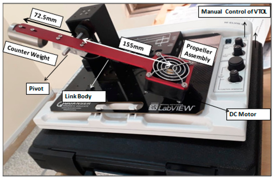 Figure 8 shows the experimental setup based on the QNET VTOL system. The 24 DC energizes the motor with 11,000 rpm connected to a solid aluminum arm. The circuit board of the QNET VTOL consists of a PWM voltage-controlled power amplifier that generates a peak current of 2 A and a continuous current of 0.5 A. The output voltage of the VTOL platform varies between 4 and 8 . The values of different physical parameters are shown and tabulated in Figure 8 and Table 1, respectively. The system is subjected to an ambient temperature of 28 degrees and humidity of 38% in the control and instrumentation lab of Balochistan University of Engineering and Technology Khuzdar, Pakistan.