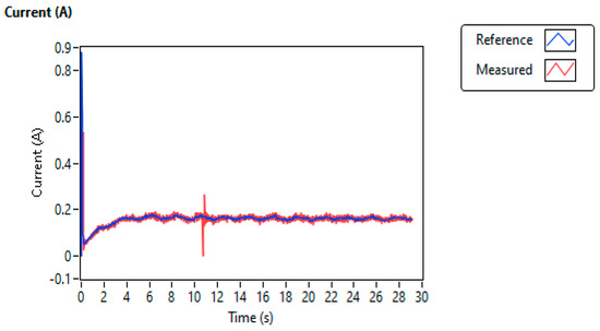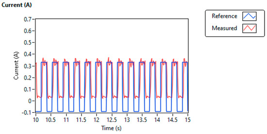 Figure 9 shows the motor current (red) of the propeller assembly with the (blue) as a reference current level. The motor current (red) of the propeller assembly tracking the (blue) as a reference current level is shown in Figure 9. The tracking performance of the motor current based on the PI controller using the experimental setup based on LabVIEW, shown in Figure 9, is closely mapped to Figure 5 based on the PI controller using MATLAB simulation. In this case, the hardware of the VTOL system is operated using a PI controller, with the gain calculated using Equation (12) as = 648 V/A and = 17.4 V/A.