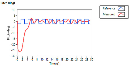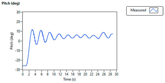Figure 10 shows the pitch (deg) of the VTOL system while oscillating along the horizontal axis based on the PI controller. Initially, at static conditions, the aluminum arm of the VTOL system reaches an angle of along the horizontal axis. When switching the VTOL experimental setup and setting the pitch (deg) parameter of the aluminum arm, raising its position, and reflecting at above the horizontal position, the system oscillation decays slowly with a significant tracking error, as observed in the simulation conducted in MATLAB and as shown in Figure 5.