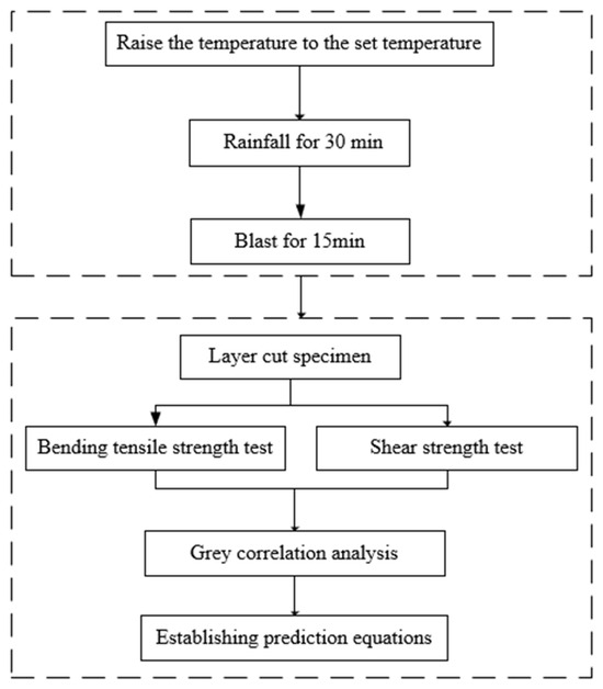 Therefore, considering the limitations of the existing test methods used to simulate the sizeable wet temperature cycle environment in South China, we used a self-made sizeable wet temperature cycle environment simulation device and layer-cut specimens to analyze and establish a prediction equation for the mechanical properties of asphalt mixtures with different air voids under the action of a sizeable wet temperature cycle, depth, and the pavement decay law, and improve the bending and tensile test and shear strength test method. To a certain extent, it makes up for the research defects in related aspects, and provides a more theoretical basis for the design of asphalt pavements in hot and humid areas of the south. Figure 1 shows the flow chart of this study.