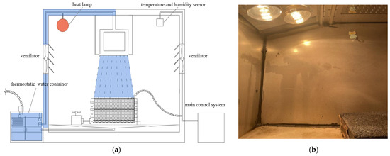 Since the existing indoor test device is not able to simulate the sizeable wet temperature cycle environment suffered by asphalt pavement, a sizeable wet temperature cycle environment simulation device was developed in this paper, whose schematic diagram is shown in Figure 2. As can be seen from the figure, the developed device mainly consists of a central control system, rainfall system, temperature control system and blower system. Its operation principle is to set test parameters (the number of sizeable wet temperature cycles, the temperature of the specimen, rainfall amount, rainfall duration, blower length, etc.) through the central control system. The temperature of the specimen is controlled by the temperature control system to reach a certain value after the system is closed. The rainfall system begins with rainfall cooling and then automatically shuts down until the rainfall reaches the set time. The air blower system is initiated to dry the specimen until the air blower time runs out, and at this time, the air blower system will be closed. The environment for sizeable wet and temperature cycles can be simulated indoors by the circulation of a heater, rainfall, and air blower.