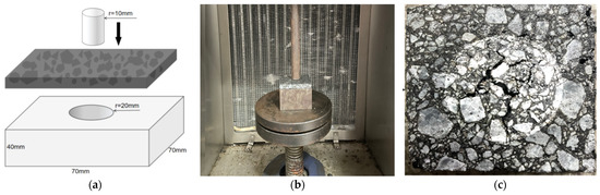 According to existing specifications [21,22], a uniaxial penetration test and triaxial compression test are used for determining the overall shear strength of the asphalt mixture. However, their test results are not capable of reflecting the changes in the shear strength with the depth of the pavement. Therefore, in order to investigate the decay law of the shear strength of the asphalt mixture with the depth of the pavement under high humidity and at high temperatures, this paper improved the test method by cutting the specimen into layers, changing the size of the specimen, and indenter and adding a base layer. Improved test specimens were prepared using the double-layer rutted specimen upper layer cut method. Layers 1–4 were cut at a uniform depth. Each layer had a length, width, and height of 70 mm, 70 mm, and 11 mm. The steel mold base had a length, width, and height of 70 mm, 70 mm, and 40 mm. The interior contained holes 40 mm in diameter. The diameter of the base of the indenter is 20 mm. The test temperature was 15 °C. The loading rate was 10 mm/min. The test process is shown in Figure 3. The shear strength is calculated by:
