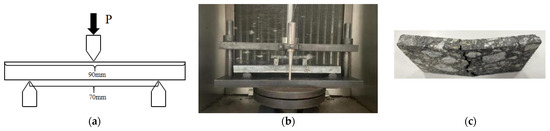 According to existing specifications [21], a flexural–tensile test was performed on small beams to evaluate the flexural–tensile properties of the asphalt mixture. However, the test results were primarily used to assess the flexural–tensile properties of the whole rutted specimen, which cannot reflect those of the mixtures at different depths. Therefore, in order to investigate the decay law of the flexural–tensile properties of the asphalt mixture with the depth of pavement under the action of a sizeable wet temperature cycle, the flexural–tensile test was modified in this paper by reducing the beam thickness and increasing the beam width to change the size of the specimen. The cut mode of the modified specimens was the same as that of the shear test. The length, width, and height of the final shear specimen were 90 mm, 50 mm and 11 mm, respectively, and the span diameter was 70 mm. The test temperature was 15 °C and the loading rate was 10 mm/min. The test process is specified in Figure 4. The flexural–tensile strength and modulus were calculated with reference to specification [21]. The decay degree was calculated by Equation (1).
