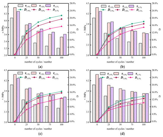 - Under the action of the sizeable wet temperature cycle, the decay degree of the flexural–tensile strength, strength modulus, and shear strength first increases rapidly and then decreases with the increase in the number of sizeable wet temperature cycles; the decay degree of the shear strength increases rapidly in the first 50 cycles, and that of the flexural–tensile strength and strength modulus increases rapidly in the first 75 cycles, and later the decay of all the three gradually slows down in subsequent cycles.