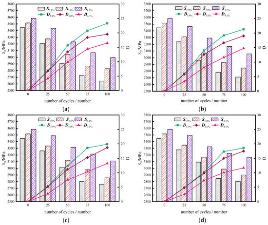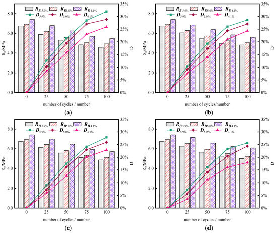 where D is the decay degree of mechanical strength (%). The standard value of mechanical strength is the average value of mechanical strength from Cut Layers 1 to Cut Layer 4 when the number of sizeable wet temperature cycles is 0.