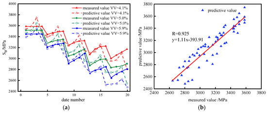 As shown in Figure 8, after the integrated coefficient KVF of the cut layer and void ratio was introduced, the accuracy of the established prediction model was reduced compared to that of the original model. However, the correlation coefficient between the predicted values was 0.925, which indicates that the prediction model still obtained good prediction results with a high fitting accuracy and reproducibility, which is conducive to the prediction of the strength modulus of the asphalt mixture under the action of a sizeable wet temperature cycle and can provide the basis for related research in the future.