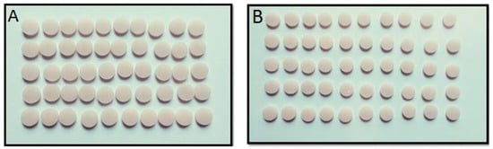 (A) Fifty specimens of (Filtek™ Z250 XT) nanohybrid composite resin. (B) Fifty specimens of (Valux™ Plus) microhybrid composite resin.
