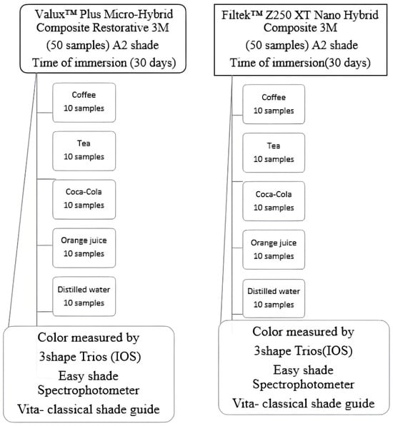 The specimens were immersed in purified water for one week. After that, specimens were divided into five subgroups (Figure 2) and exposed to tea (Lipton yellow label tea, Dubai, UAE) coffee (Nestle, Switzerland), orange juice (Almarai 100% natural, Saudi Arabian), Coca-Cola (Coca Cola Co., Ltd., Dubai, UAE), and distilled water (Nove medic, Jonkoping, Sweden), as a control group. The results were evaluated by three different color measurement methods.