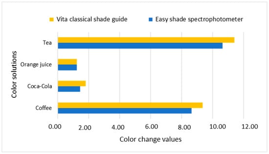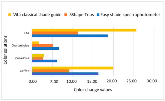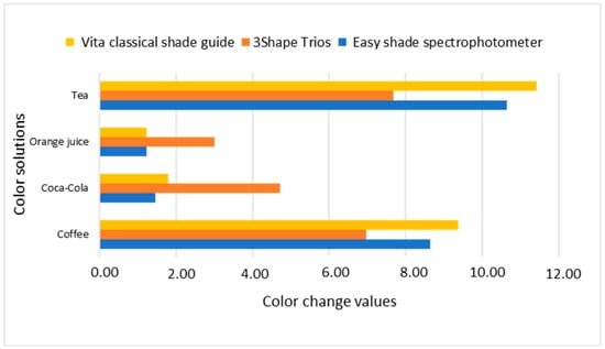 The ΔE00 values of both composite resins (microhybrid and nanohybrid) were determined with reference to the Vita classical shade guide. ΔE00 of coffee (14.1–20.19) and in tea (15.6–25), followed by ΔE00 values from the Easyshade spectrophotometer for coffee (11–20.7) and tea (14.24–23.21), then by 3Shape Trios for coffee (5.14–9.7) and tea (6.5–12.5), were all clinically severely unacceptable.