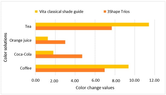 In contrast, ΔE00 results obtained by the Vita classical shade guide for Coca-Cola (3.2–3.75) and orange Juice (3.9–4.19) indicated clinically clearly unacceptable levels. At the same time, ΔE00 results demonstrated by spectrophotometer and 3Shape Trios were indicated as moderately unacceptable, including ΔE00 values measured by the spectrophotometer for Coca-Cola (1.78–3) and orange Juice (2.56–2.82), as well as the results obtained by 3Shape Trios ΔE00 for Coca-Cola (2.85–2.9) and orange Juice (3–3.2) (Figure 5, Figure 6 and Figure 7).