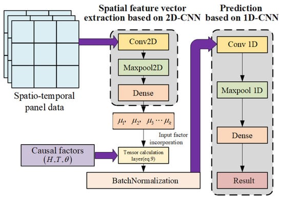 The literature [22] pointed out that the spatial correlation between the measuring point deformation sequences is manifested by the correlation between the change patterns of the displacement values of each measuring point within the same period, and, on this basis, the spatial correlation of the measuring point deformation is quantified by the time series similarity. In this paper, based on work in the literature [22], a 2D-1D-CNN model is constructed by combining the idea of spatio-temporal data modeling and extracting the spatial features among measuring points through convolutional neural networks. The model consists of three parts, 2D-CNN, 1D-CNN and a tensor calculation layer. Among them, the 2D-CNN part extracts the spatial feature vector , which can reflect the spatial features of each moment, from the historical deformation sequence of multiple measuring points, and replaces the spatial coordinates in the traditional multiple measuring point model with it. The tensor calculation layer refers to the expression of the traditional multi-point model and combines the spatial feature factor with the causal factors of the dam deformation to obtain the final input factors. Considering the advantages of 1D-CNN in sequence prediction with fewer parameters and higher prediction accuracy [23], 1D-CNN is selected in this paper to construct the nonlinear relationship between input factors and measuring point deformation to obtain the final prediction results. The specific structure of the 2D-1D-CNN model is shown in Figure 1.