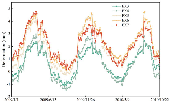 Based on the above method, a 2D-1D-CNN model is constructed for concrete dam deformation prediction based on the actual monitoring data of a hydropower station in the south of China, which has a maximum dam height of 67.5 m and a total installed capacity of 4 × 18,000 kW. The project profile is shown in Figure 3. In this paper, the deformation data from 1 January 2009 to 22 October 2010 (shown in Figure 4) were selected from measuring points EX3-EX7 in the dam crest tension line, and the sampling interval was once every 5 days. Root Mean Square Error (RMSE), Mean Absolute Error (MAE) and Mean Square Error (MSE) were used as statistical indexes.