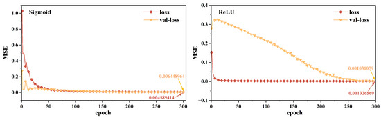 The ReLU activation function is chosen for the proposed model in this paper. In order to verify the effect of different activation functions on the model, we constructed a 2D-1D-CNN model based on the sigmiod activation function, and analyzed the effect of different activation functions on the prediction performance of the model through the change of the loss curves of these two models during the training process, as shown in Figure 5.