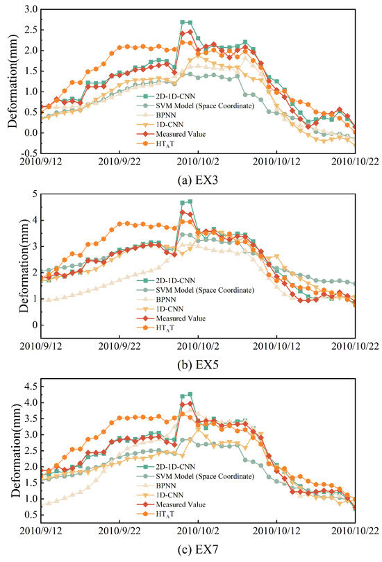 Table 2 shows that the average RMSE index of the proposed model in this paper achieves 72.6%, 74.58% and 69.89% relative to the single-point BPNN model, multi-point SVM model and 1D-CNN, respectively, indicating that the proposed model is reasonable and effective. Compared with the comparison models, the prediction accuracy of the proposed model is higher, which is mainly because the 2D-1D-CNN model models multiple measuring points at the same time, considering the interconnection of displacement values among multiple measuring points on the one hand, and considering the deformation sequences of multiple measuring points while, at the same time, also expanding the training samples of the model to a certain extent. In addition, the deep learning model can fully consider the influence of the environmental factors on the deformation of the measuring points at the historical time (i.e., the lag effect of the causal factors) and the change law of the spatial association of the deformation of the measuring points with time (i.e., the change characteristic of the spatial association of multiple measuring points), so its prediction accuracy is higher than that of the machine-learning-based model and the shallow artificial neural network in most cases.