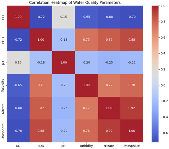 The water-quality indices that were collected include Dissolved Oxygen (DO), Biological Oxygen Demand (BOD), pH, Turbidity, Nitrate, and Phosphate, among others. These indices were selected for their sensitivity to various pollution sources and their standard use in assessing water quality [24,25,26].