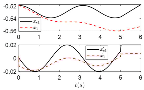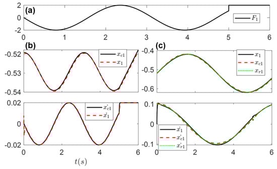 In direct tracking, the sliding surface and a corresponding proper control yield good performance, as shown in Figure 1a,b in both joint and Cartesian spaces, where a simple 2-DoF manipulator is simulated. It is important to note that to avoid confusion between the x-dimension and the pose of the end-effector in Cartesian space (both typically denoted by ‘x’), this paper uses the numerals 1 and 2 to represent the translational dimensions of x and y, respectively. This notation convention will be consistently used in all subsequent figures.