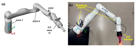 where denotes the robot’s joint angles, and and represent accelerations and velocities. represents a symmetric positive definite inertia matrix; is Coriolis and centrifugal matrix; is a torque vector generated by gravity; and represents applied torque and external torque, respectively. To adapt to the admittance implemented in the workspace, Equation (12) is written in the Cartesian space as