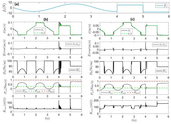 The comparison is presented in Figure 1e,f for the robot being a passive follower and a compliant leader, respectively, with the same force profile. In the human-leading case, no reference trajectory is defined, and the tracking is less accurate. In contrast, accurate tracking for both referenced trajectory and the robot’s desired response in the human-following case is observed.